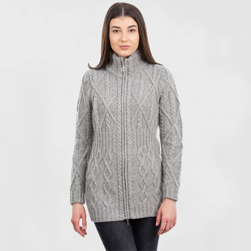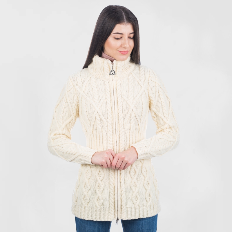 Authentically crafted in Ireland, our ladies’ Aran cable zipper cardigan is a wonderful addition to anyone’s wardrobe and would make a perfect culturally-inspired gift for yourself or your loved ones!