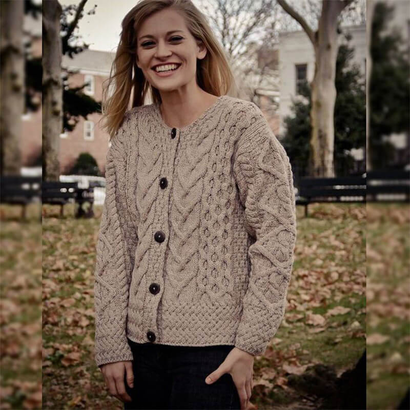Our Ladies Aran Cable Knit Cardigan is one of the customer's favorite Irish knit cardigans , bursting with oversized Irish knit patterns that stand out against the base and add a beautiful texture to this classic piece of Irish knitwear. The cable patterns down either side of the front are bordered by a traditional honeycomb at the sides, while the sleeves feature a gorgeous geometric diamond pattern over layed above a single cable. The cuffs and waist are accented with a trellis stitch, giving this sweater a homemade feel.