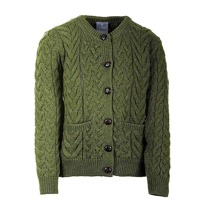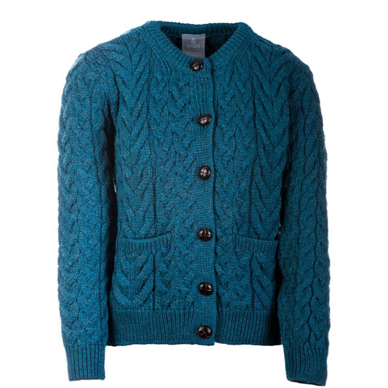 Our Supersoft Aran Wool Lumber Jacket Cardigan is a versatile and stylish choice that allows you to showcase both your fashion sense and appreciation for traditional Irish craftsmanship while staying warm and comfortable.The cardigan is crafted from 100% durable and heat-insulating supersoft Merino Wool ensuring this knitwear piece will keep you warm in cold weather and cool in hotter seasons. Merino Wool is a natural and sustainable material making this cardigan an eco-friendly choice for your style options. The harmonious blend of Aran stitching patterns adds a unique and traditional touch to the design creating a textured and visually appealing pattern on the jacket. The cable stitches are inspired by the ropes and cables used by Irish fishermen and represent safety, strength, and a link to the sea. The basket stitch represents the baskets fishermen would use to store fish on their boats, hoping for abundant fish and success at sea. The cardigan is tailored with a heavy ribbed rounded collar that adds warmth and comfort and provides a distinctive and stylish element to the neckline. The inclusion of two pockets is a practical feature that adds functionality to the cardigan. You can keep your hands warm or carry small items.The large brown football buttons serve as functional closures and also play a significant role in the overall aesthetic of this piece. Made in Ireland, our cardigan from Aran Woollen Mills offers style, warmth, versatility, and a connection to the rich tradition of Irish knitwear, and would make a versatile choice for those who value both fashion and heritage.