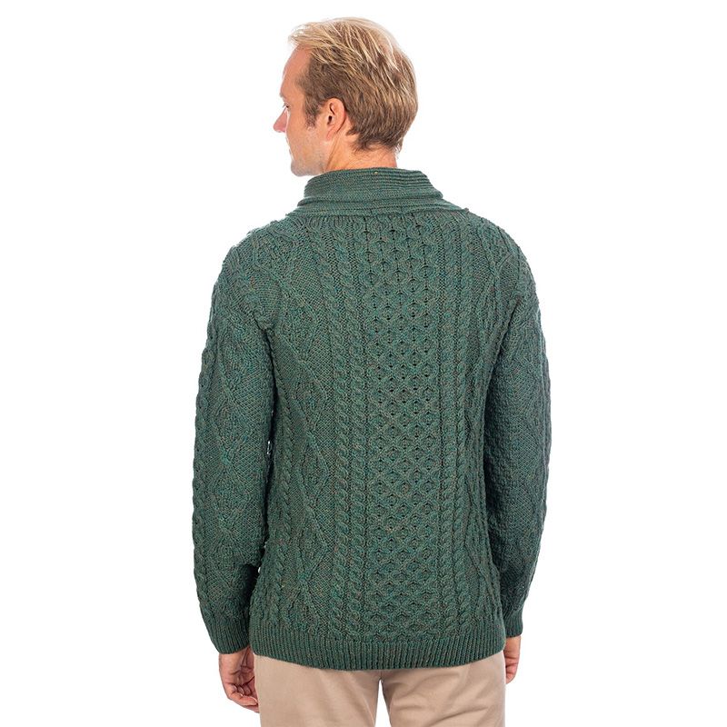 Staying warm never looked so handsome! Our Men's One Button Shawl Collar Wool Cable Sweater features an elegant shawl collar with a single button closure, making it a perfect dress up or dress down knit. Classic Aran stitches diamond, honeycomb, and cable decorate the body and sleeves of the sweater, adding interest and texture. Traditional Aran sweaters used the different stitches to add warmth to the original garments, and the different patterns each held a different meaning. 100% Merino wool construction makes this sweater wonderfully sturdy while remaining quite soft and warm. Keep it classic in white, like the undyed wool of the original fisherman sweaters, or add some color with Connemara Green or Atlantic Blue. Made in Ireland by SAOL, a modern maker of knits that combine traditional Irish design with contemporary and stylish shapes. Dry clean, or hand wash in lukewarm water with a gentle detergent and lay flat to dry.