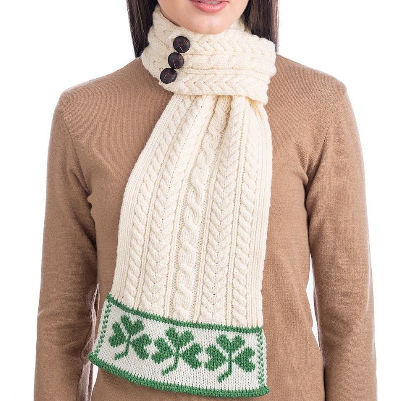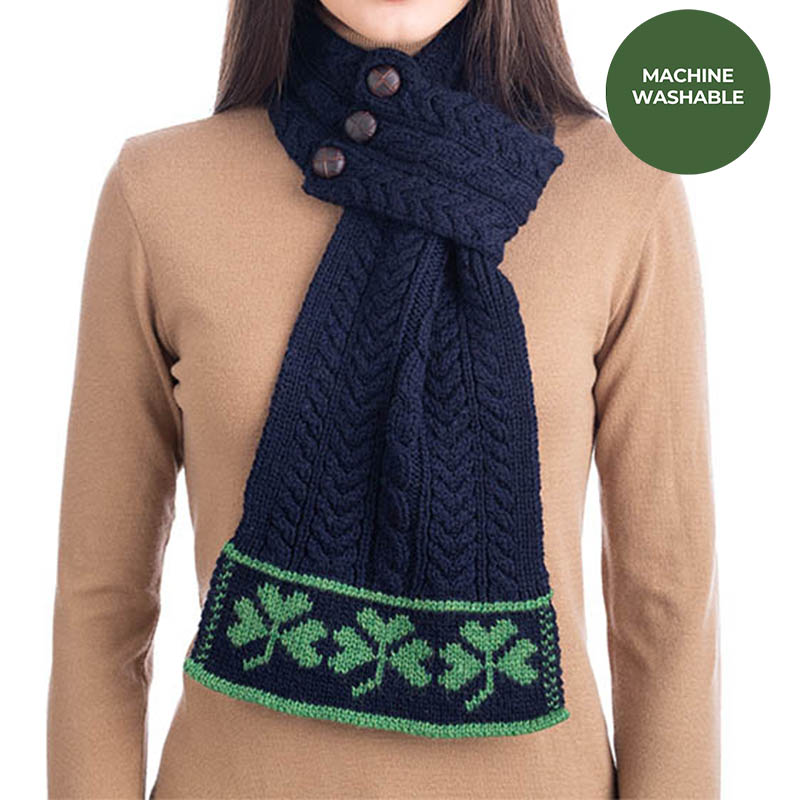 Three buttons keep this scarf snug and cozy for blustery days. Cable knitting brings to mind traditional Aran sweaters, where the classic stitches represented the ropes used by the Islands' fishermen. Available in Navy with Green Shamrocks, Natural White with Green Shamrocks, and Green with contrasting White Shamrocks.