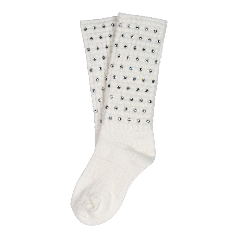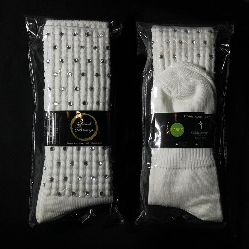 ■ Crisp white Irish dancing socks with clear crystal embellishments for an elegant touch
