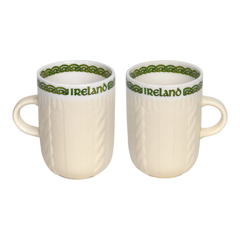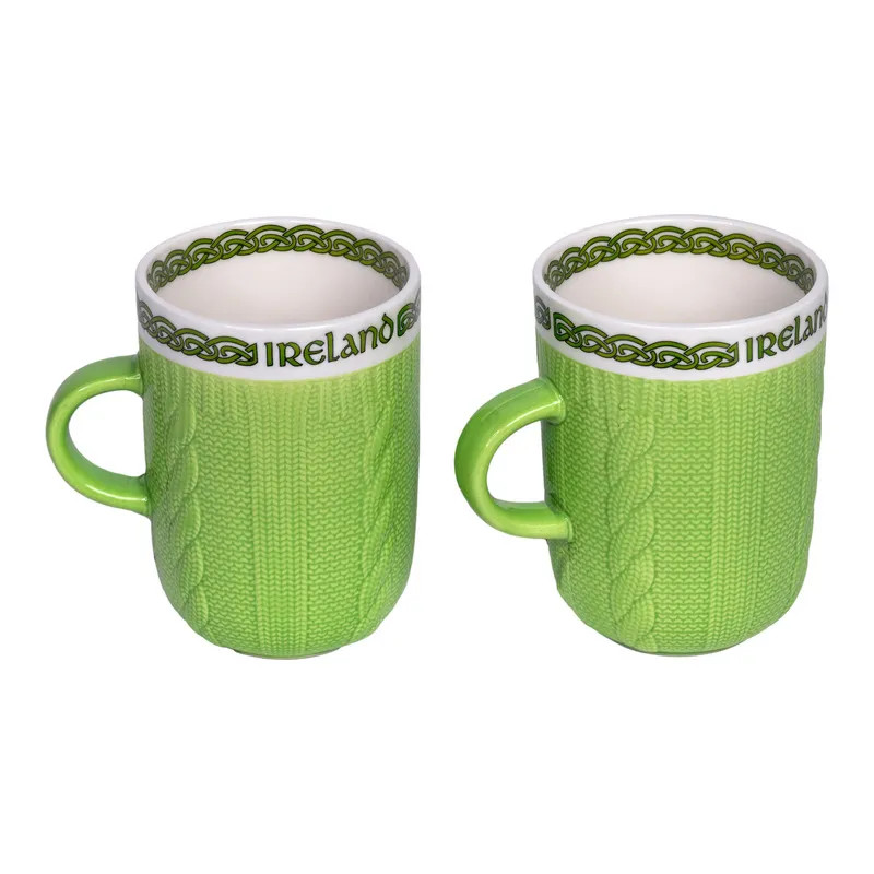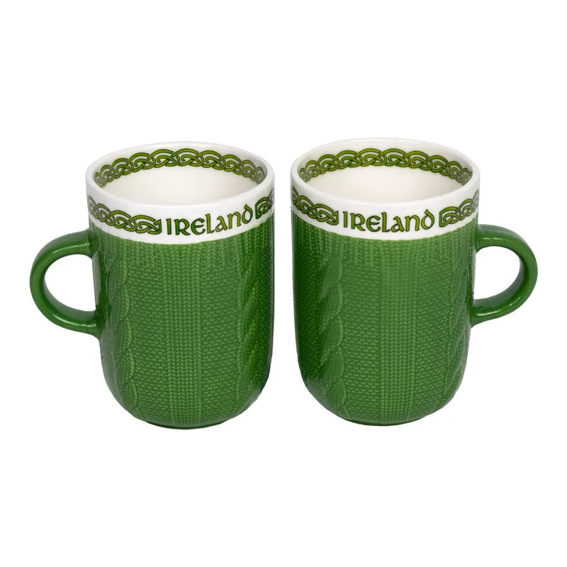 Our Aran Stitch Embossment Irish Coffee Mug is a beautiful gift from the Emerald Isle, designed to be treasured forever! This mug is as special as it looks, featuring richly detailed Aran cable-like embossed patterns– it looks just like the authentic Irish sweaters worn in Ireland for centuries! In Irish knitting traditions, the cable stitch mirrors the ropes used by the fishermen and represents strength and unity. In other interpretations, it’s a heartwarming prayer for safety at sea, often knit into sweaters by the wives and sisters of the fishermen. Plus, it features printed ‘Ireland’ lettering and knotwork inside & out, a symbol of never-ending connection.