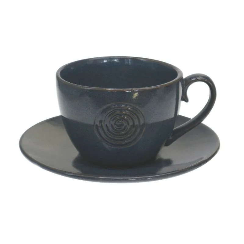 ■ Cup and matching saucer in a rich cobalt blue with a gentle spiral accent
