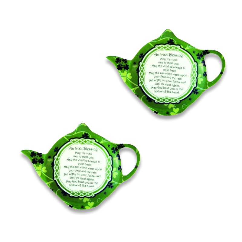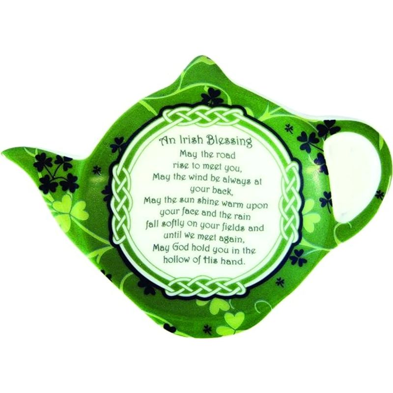 Bring a touch of the Emerald Isle into your everyday life with our Irish Blessing Bone China Tea Bag Holder! Adorned with the iconic shamrock, a symbol rich in Irish heritage, along with a heartfelt Irish blessing, this holder brings good fortune and charm to your tea time. Legend says St. Patrick used the shamrock to explain the Holy Trinity to the Irish.. The Irish blessing, often passed down through generations, wishes your loved ones good health, safety, and a prosperous path in life, carrying with it a message of positivity and divine protection. The design also features intricate Celtic knots, symbols of eternal life and the interconnectedness of all things.