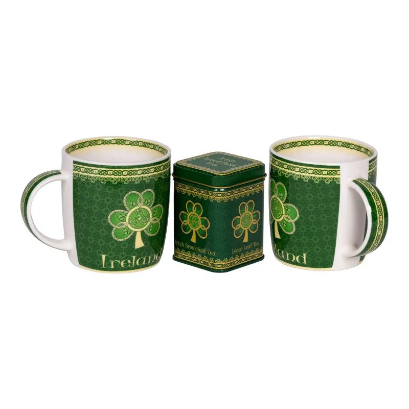 Our Shamrock Irish Tea Set – 2 Mugs & Irish Breakfast Tea feels like an invitation to slow down. It features 2 mugs and a tin of Irish breakfast tea, the kind of set that makes tea feel less like a routine and more like a ritual, something you look forward to. Shamrocks scatter across these pieces like quiet notes of love, faith and hope, while Celtic knotwork weaves its endless loops around the surface. Side by side, they look like they belong, and they carry that feeling of togetherness into every cup you share. The shamrock is Ireland’s little green emblem of hope and fortune, small but strong. The knotwork, with its never-ending lines, tells a different story: of bonds that don’t break, no matter how far or how long. Holding one of these mugs feels a bit like holding on to that heritage.If you want to round it out, add our Celtic Designed Bowl Set to the table .
