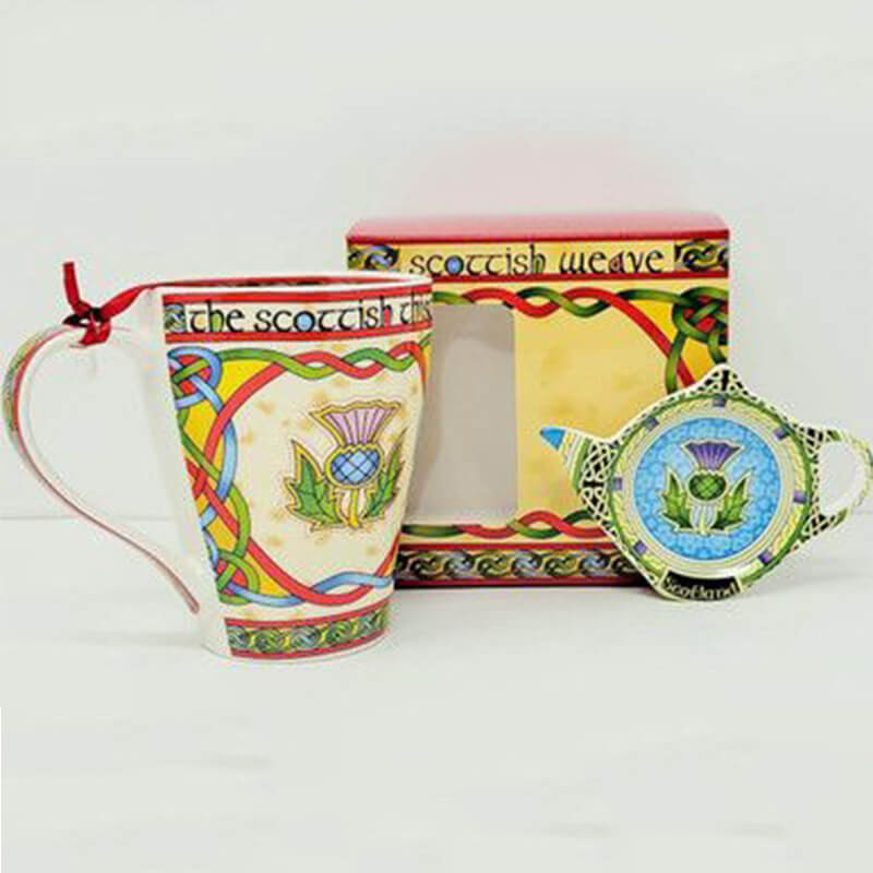 This Scottish Thistle Celtic Mug & Teabag Holder is the perfect companion to your busy mornings and cups of coffee or tea. Proudly displaying the thistle, the national flower of Scotland, this set tells the story of Scottish bravery and resilience. Legends say that once it was a thistle that saved a Scottish party when a Norse invader stepped on it, crying out in agony and waking up the slumbering warriors that defeated them. The set also features traditional Celtic artwork made up of intricate spirals that add a touch of Celtic elegance to any table setting. Made of 100% bone china, the mug and teabag holder are not only stunningly beautiful, but also durable, heat and chip resistant, and strong, being safe for use in a dishwasher and in a microwave. The mug has a capacity of 13 fluid oz, and the teabag holder measures 3.5 inches by 5.0 inches.