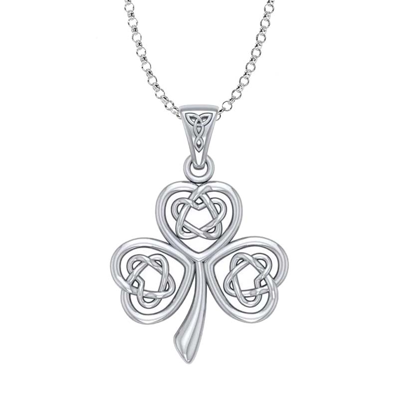 The pendant is shaped like an iconic Irish shamrock, a symbol that is associated with Saint Patrick, the Patron Saint of Ireland. The shamrock is believed to represent the Holy Trinity in Irish Christian tradition, as well as three heartwarming concepts: love, faith, and hope. The three-leaved clover is adorned with Celtic knotwork, displaying infinitely intertwining lines, as a reminder of the eternity and connectivity of all things in life. The clasp where you can place the necklace is also adorned with Celtic motifs. The Trinity knot on the clasp represents the Father, Son, and Holy Spirit.
